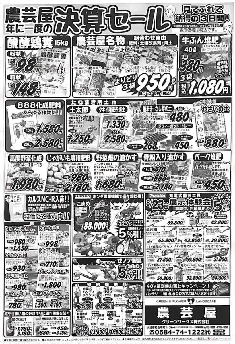農芸屋では8月23日(金)から8月25日(日)年に一度の大決算セールを開催します。