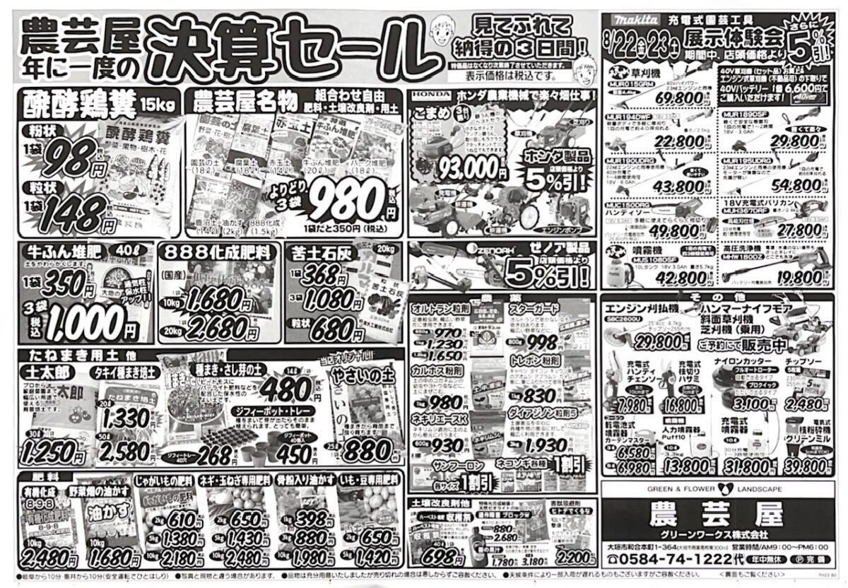 農芸屋では8月22日(金)から8月24日(日)年に一度の大決算セールを開催します。