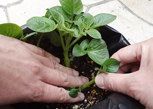 植え付けてからしばらくすると、種芋についていた分だけ新芽が出てきます。そのままにしておくと茎や葉が茂って風通しが悪くなるばかりではなく、地上部の成長に栄養が消費され、芋が大きく育たなくなってしまいます。芽が8~10cmに育ったら芽かきを行いましょう。