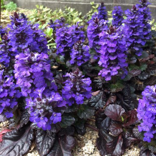 低い草丈で這うように広がるアジュラは、濃い紫、白やピンクの斑入り、緑にクリーム色の斑入りなど葉のバリエーションが豊富なだけではなく、春から初夏にかけてピンクや青紫色の花を多数咲かせてくれるカラーリーフです。