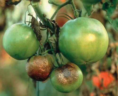疫病は葉や茎では灰緑色~暗褐色の病斑や白色のカビ、実にはチョコレート色の病斑が出て腐る病気です。土中の菌が原因で発生するだけではなく、発病した葉などについた水がほかの部位に跳ねてつくことで伝染します。