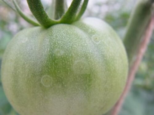 「灰色カビ病」は暗褐色で楕円形をした大きな模様が現れ、灰色のカビが発生する病気で、葉はもちろん実にも発生しやすい病気です。放置していると実全体がカビに覆われたり、発病部より上が全て枯れてしまったりします。