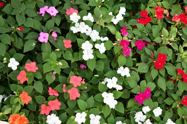 インパチェンスは熱帯アフリカを原産とするツリフネソウ科の植物で、白、赤、ピンク、オレンジの可憐な花をたくさん咲かせてくれます。夏は少し弱って花つきが悪くなりますが、花期が5月から11月頃までと長く、日陰でも育つことから夏のガーデニングの定番として親しまれています。