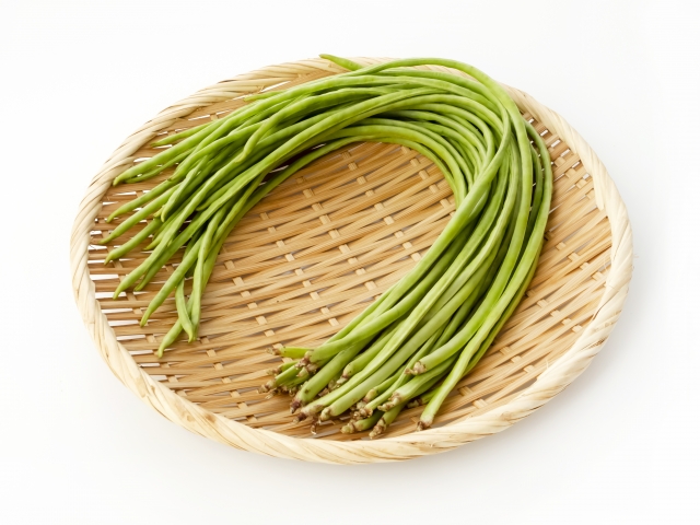 ササゲは小豆に似た赤い豆で、ひょろりと長いサヤが特徴です。種まきは7月上旬から、収穫は9月以降が目安です。