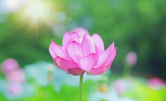ハスの花の見頃は7月中旬から8月中旬。朝に開花し、午後には花を閉じるという特徴があります。よく似た水生植物にスイレンがありますが、ハスは水面より上に花を咲かせるのに対し、スイレンは水面に花を浮かべるという違いがあります。