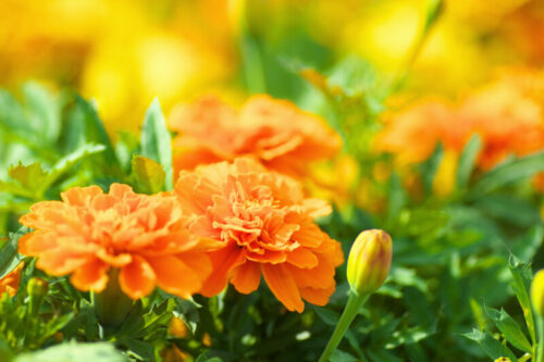 マリーゴールドは、虫除け効果があることで知られ、花壇のコンパニオンプランツとしても活躍します。鮮やかなオレンジや黄色の花が、暑い夏にも負けずに咲き続けます。独特の香りも特徴的です。